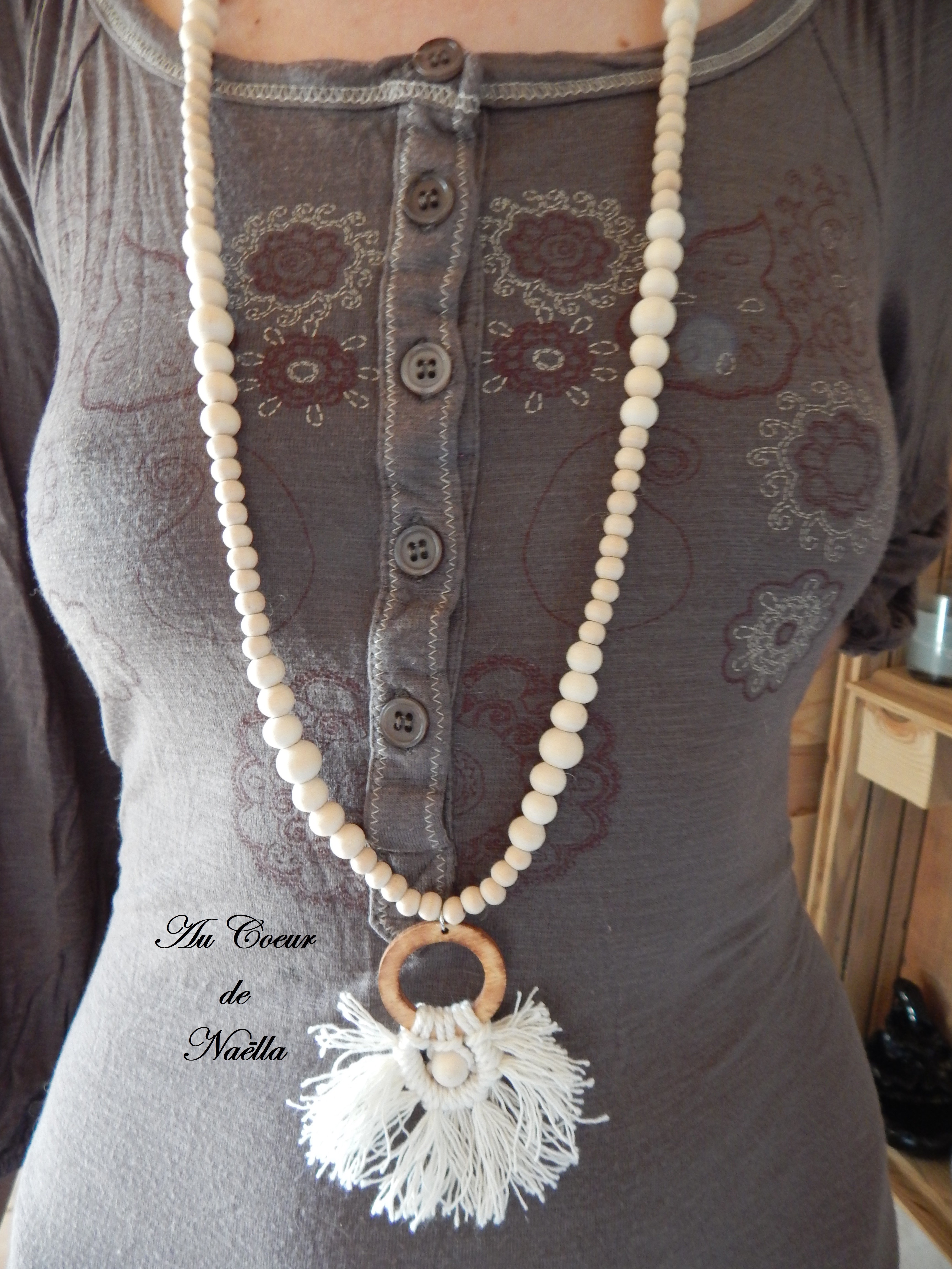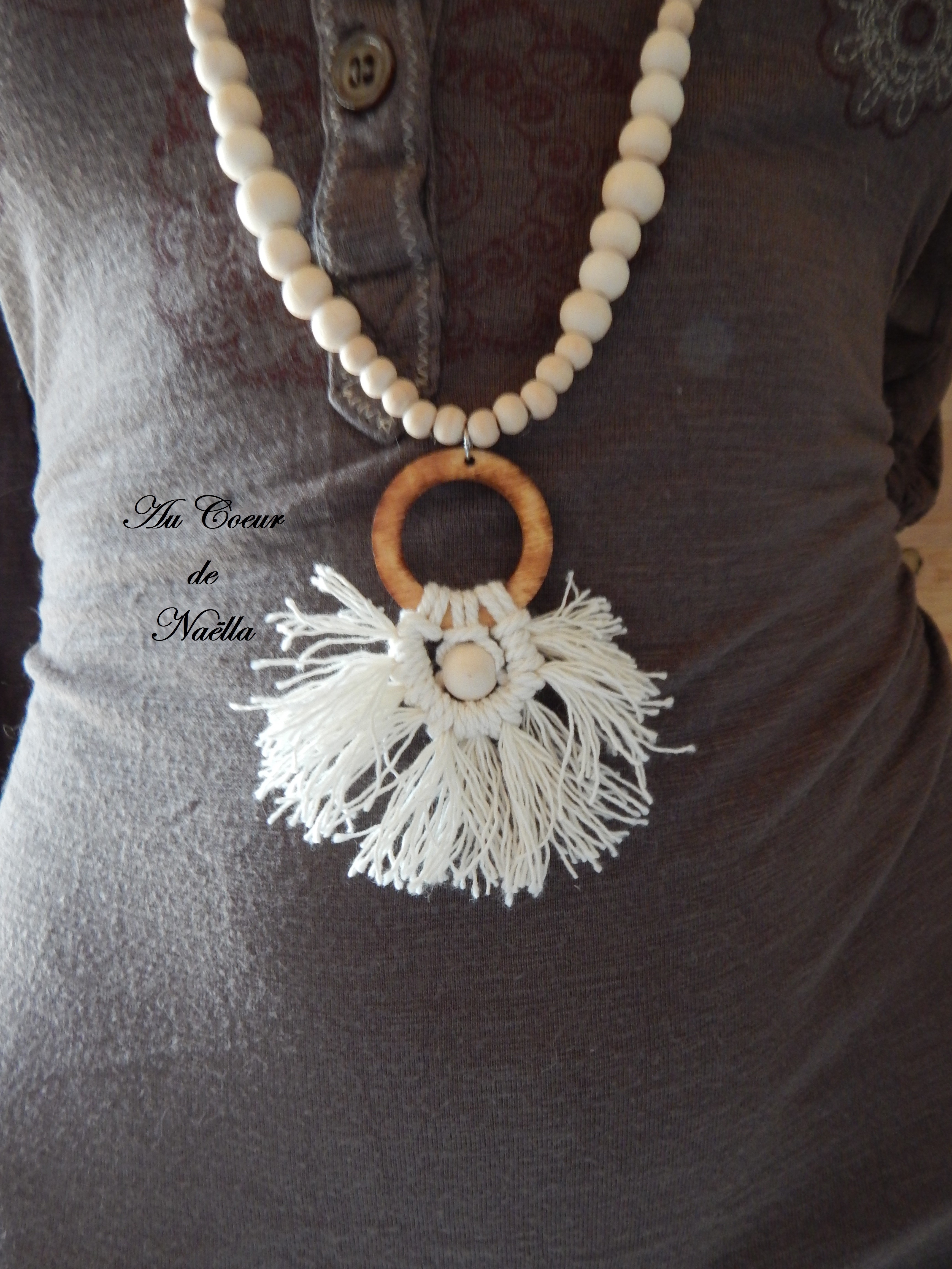 Matériaux du pendentif : coton, perles en bois brut, anneau en bois brûlé au pyrograveur, anneau en acier.