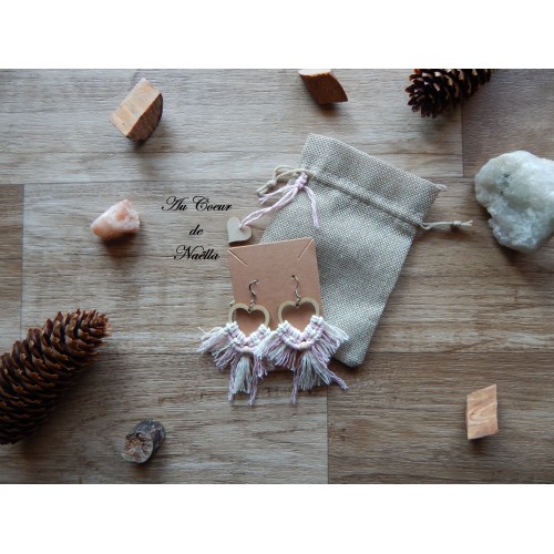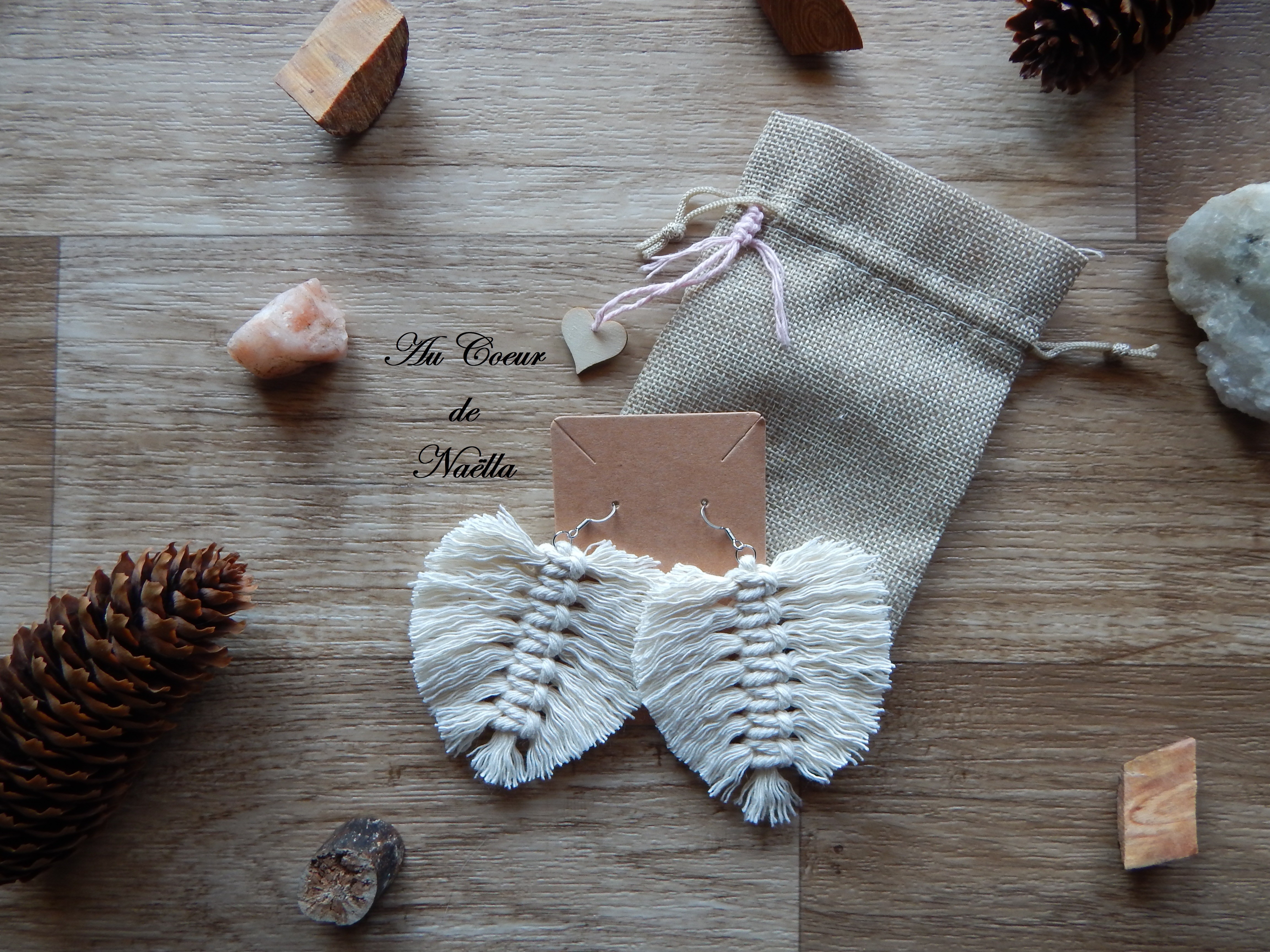 Matériaux du pochon : chanvre synthétique, coeur en bois brut, macramé de coton.