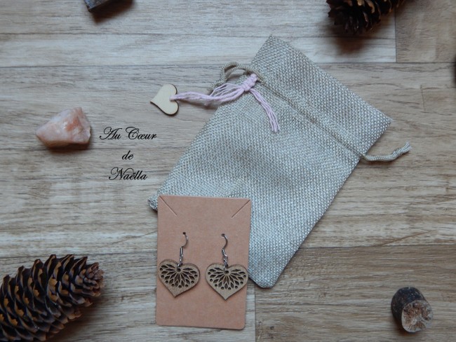 Matériaux du pochon : chanvre synthétique, coeur en bois brut, macramé de coton.