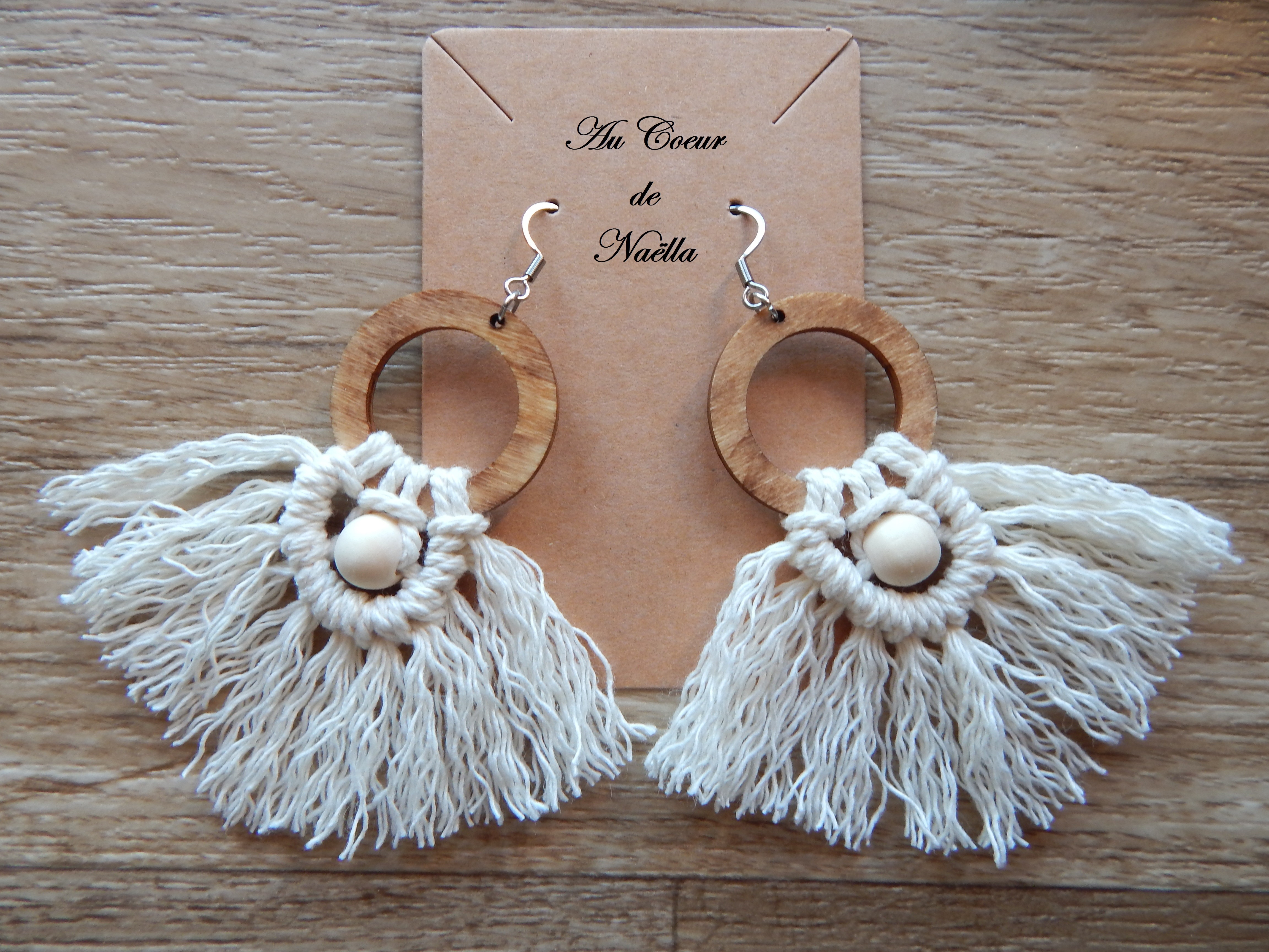 Matériaux des boucles d'oreilles : coton, perles en bois brut, anneaux en bois (brûlés à la main au pyrograveur), crochets et anneaux en acier inoxydable.