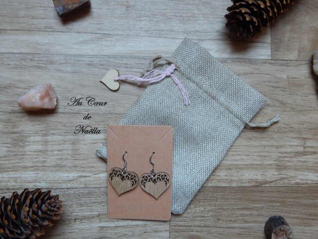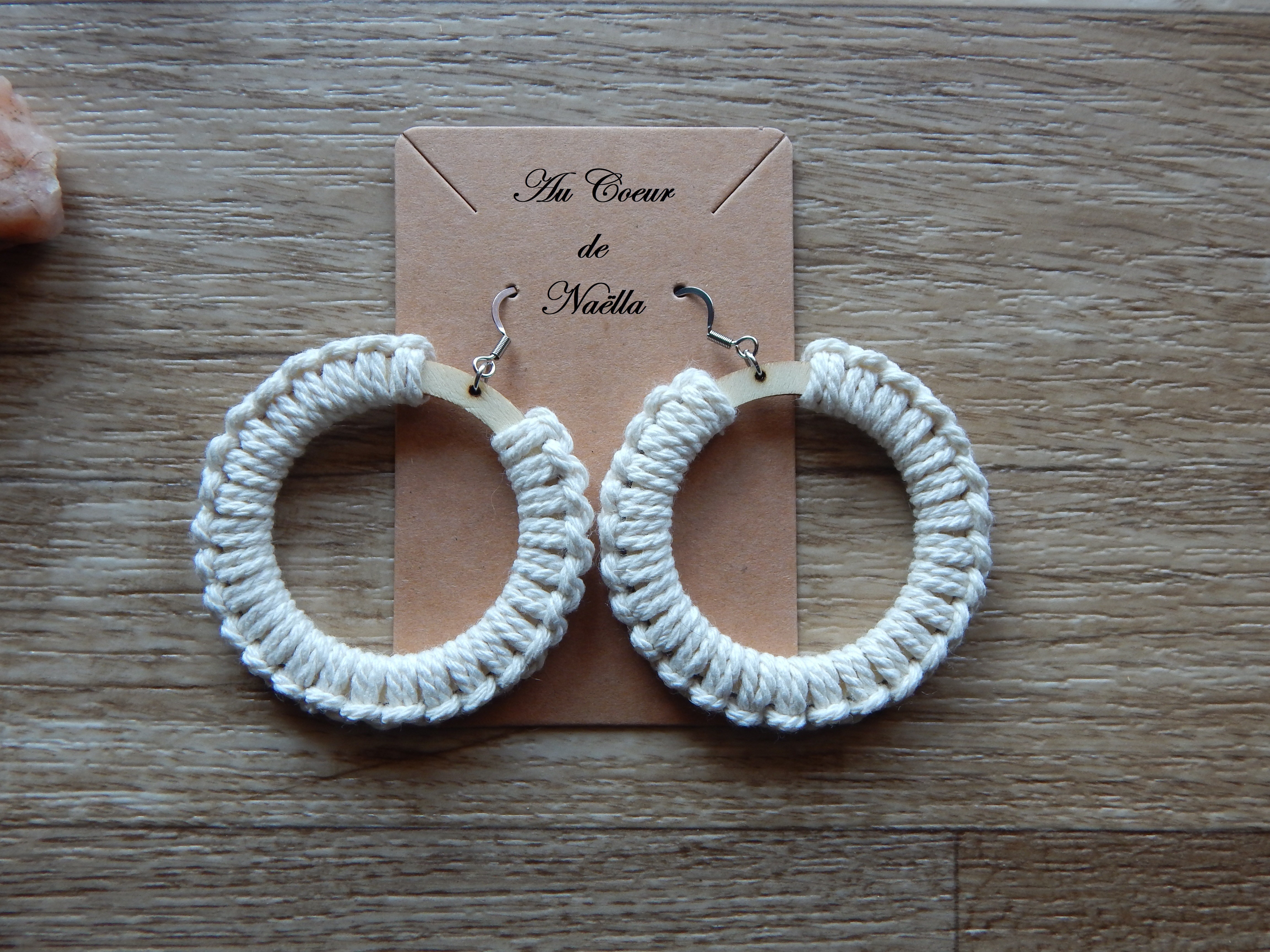 Matériaux des boucles d'oreilles : coton, anneaux en bois brut, crochets et anneaux en acier inoxydable.