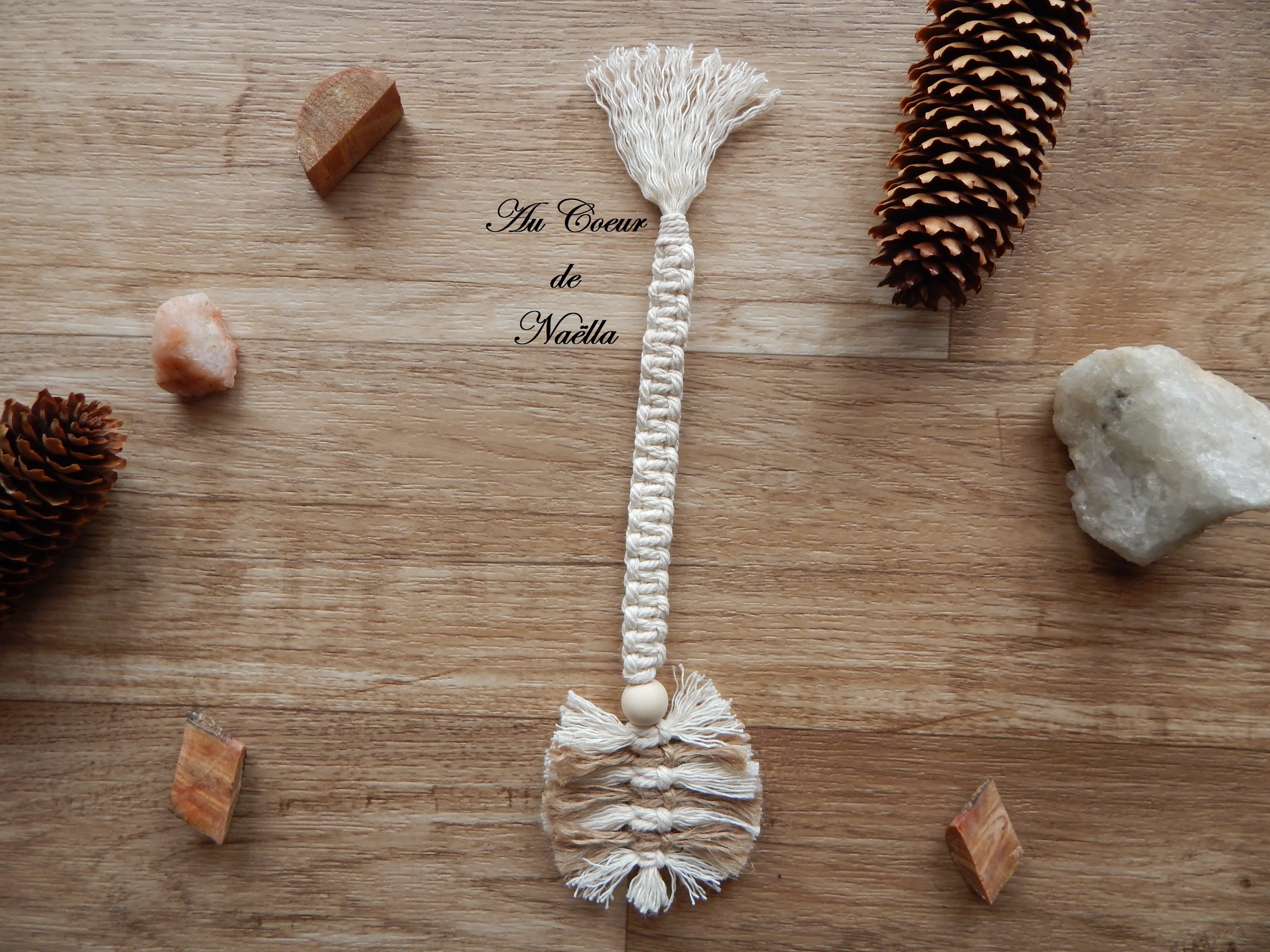 Matériaux : coton écru, jute, perle en bois brut.