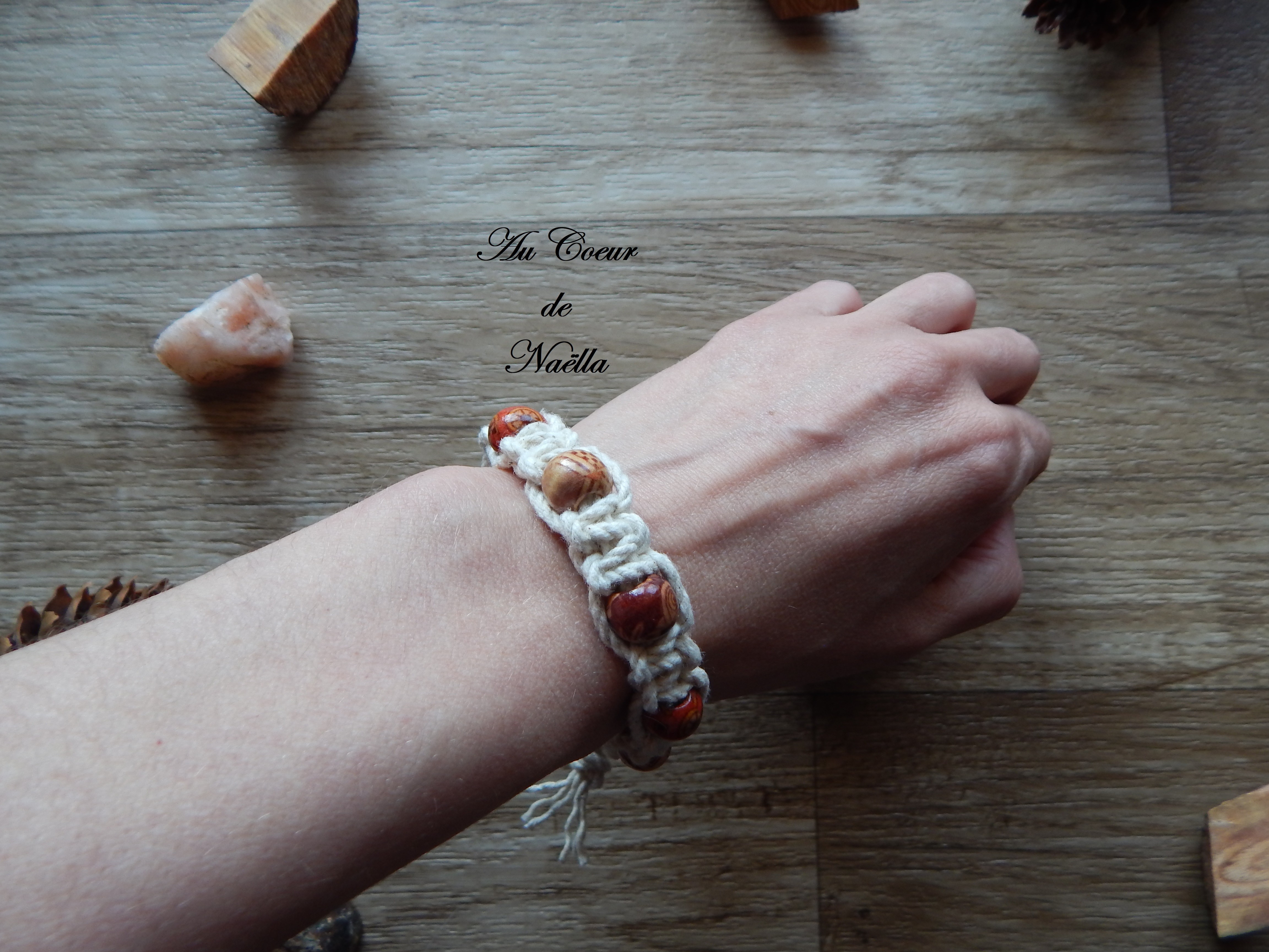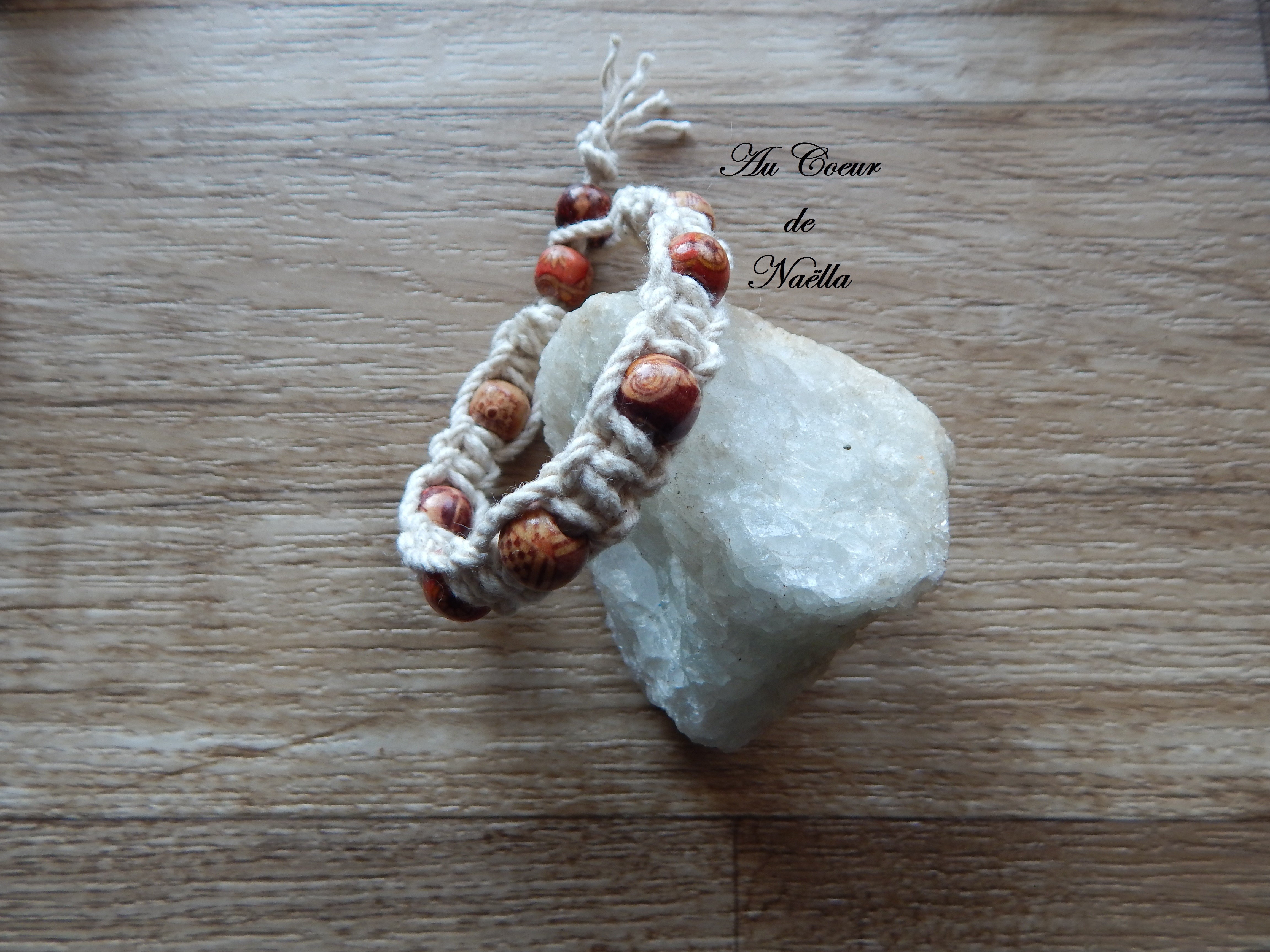 Matériaux du bracelet : coton torsadé non ciré, perles en bois peintes à motifs.