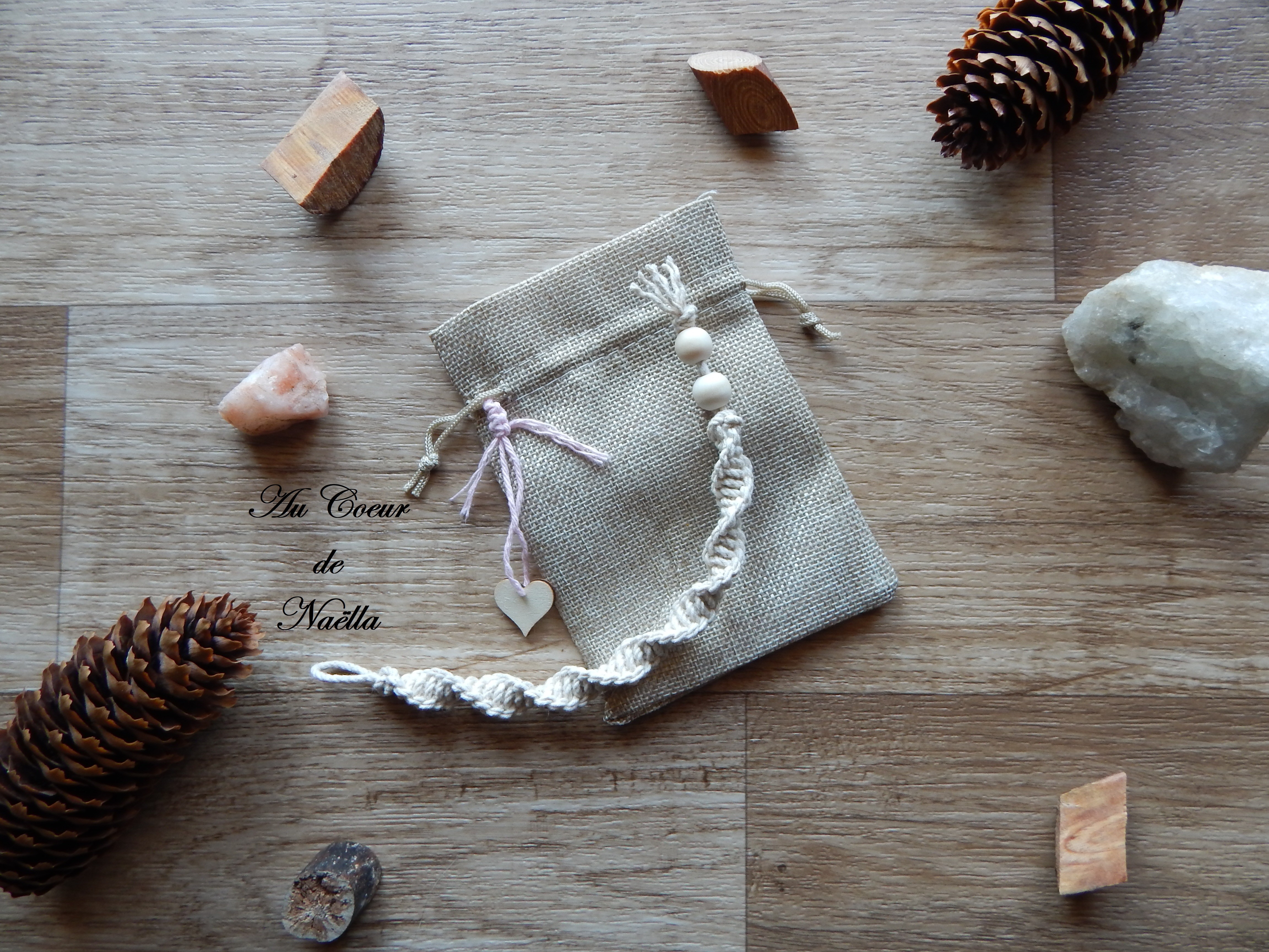 Matériaux du pochon : chanvre synthétique, coeur en bois brut, macramé de coton.