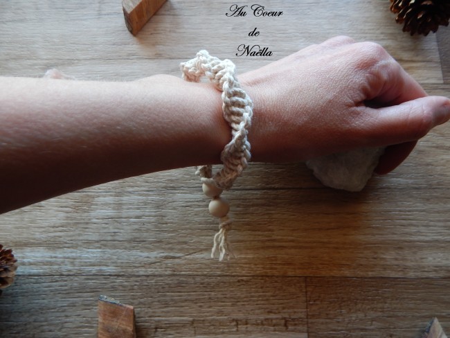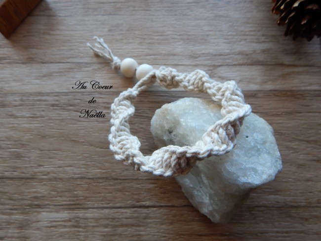 Matériaux du bracelet : coton torsadé non ciré, perles en bois brut.