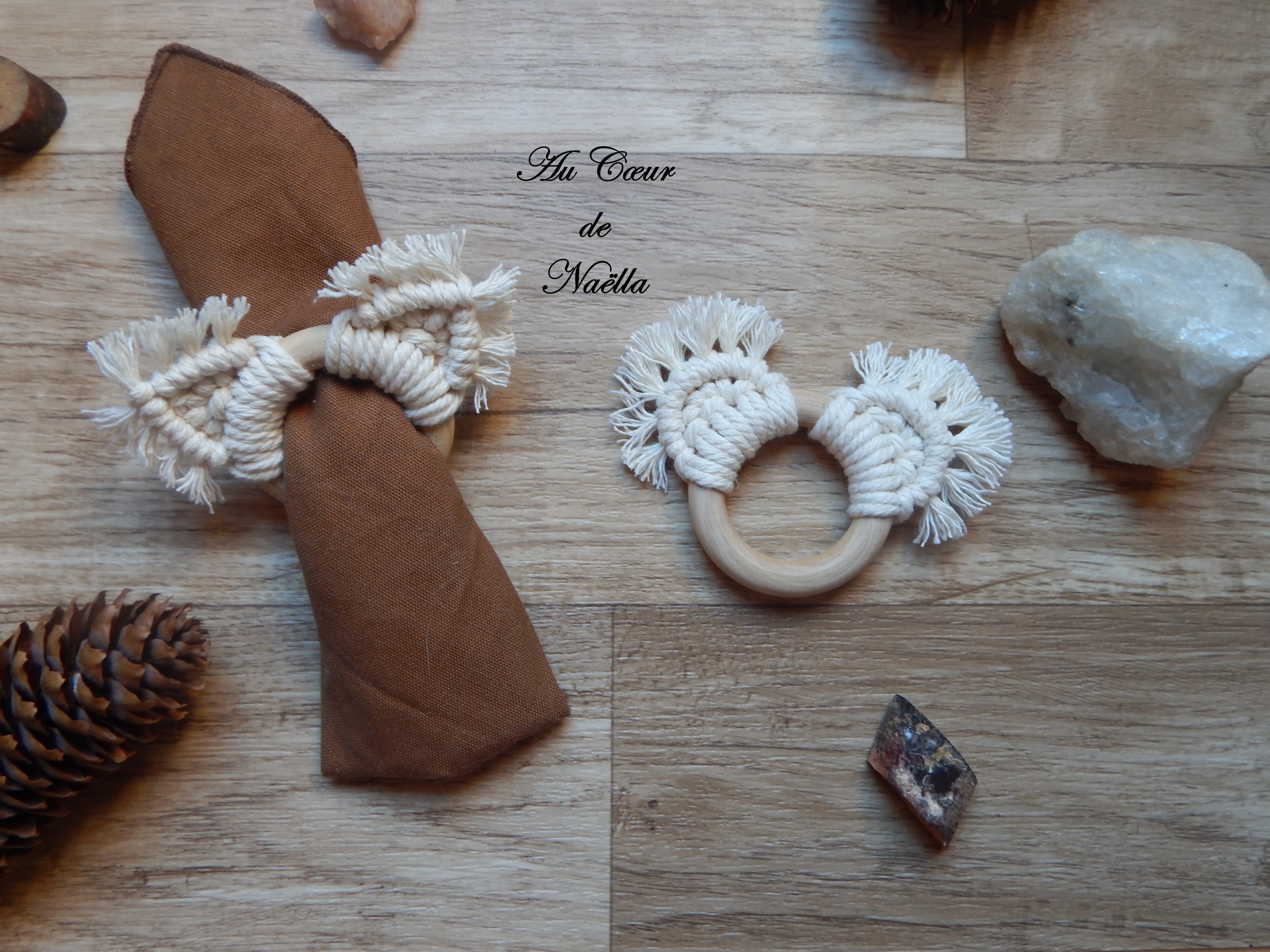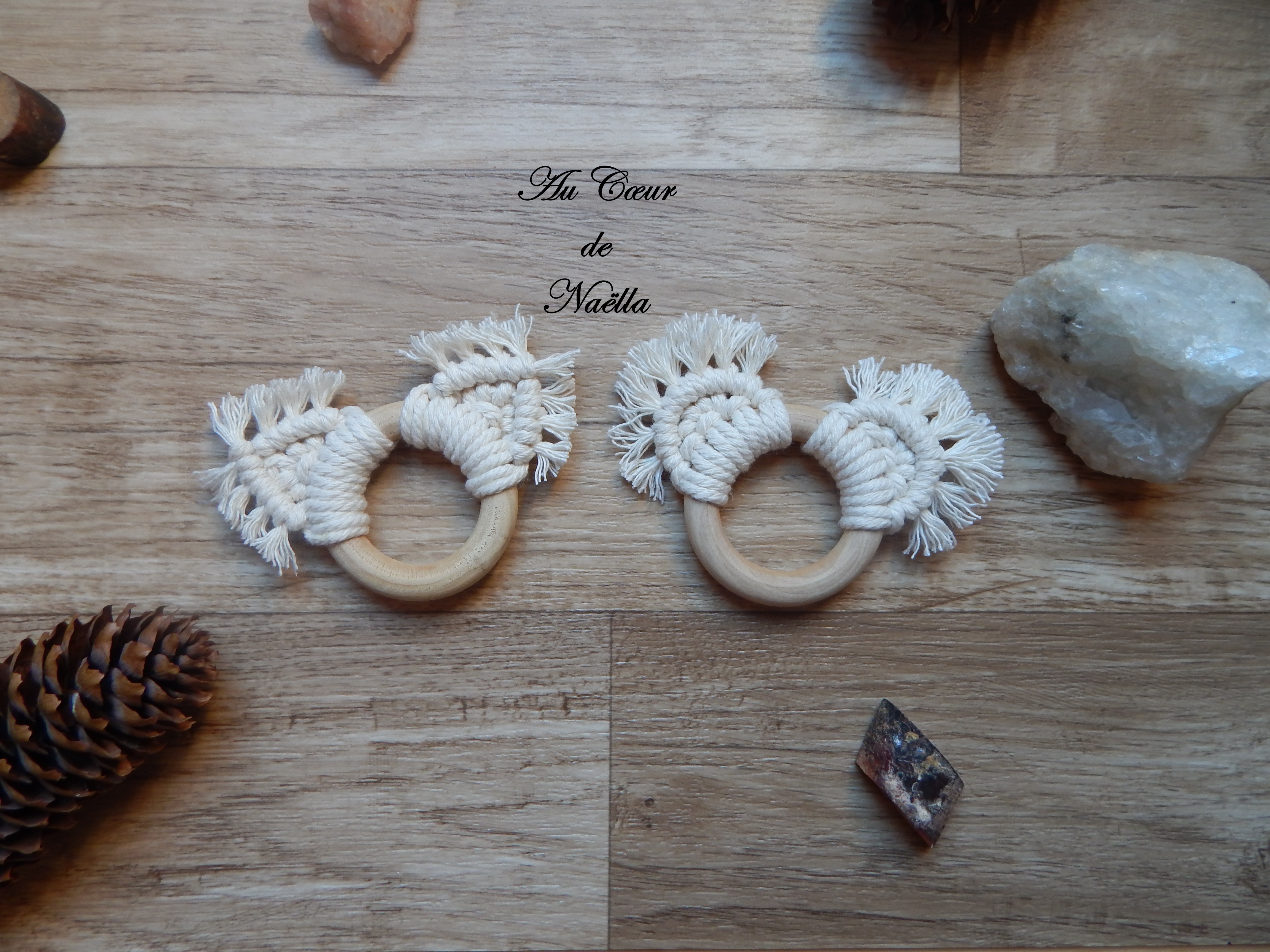 Matériaux : coton, anneaux en bois brut.