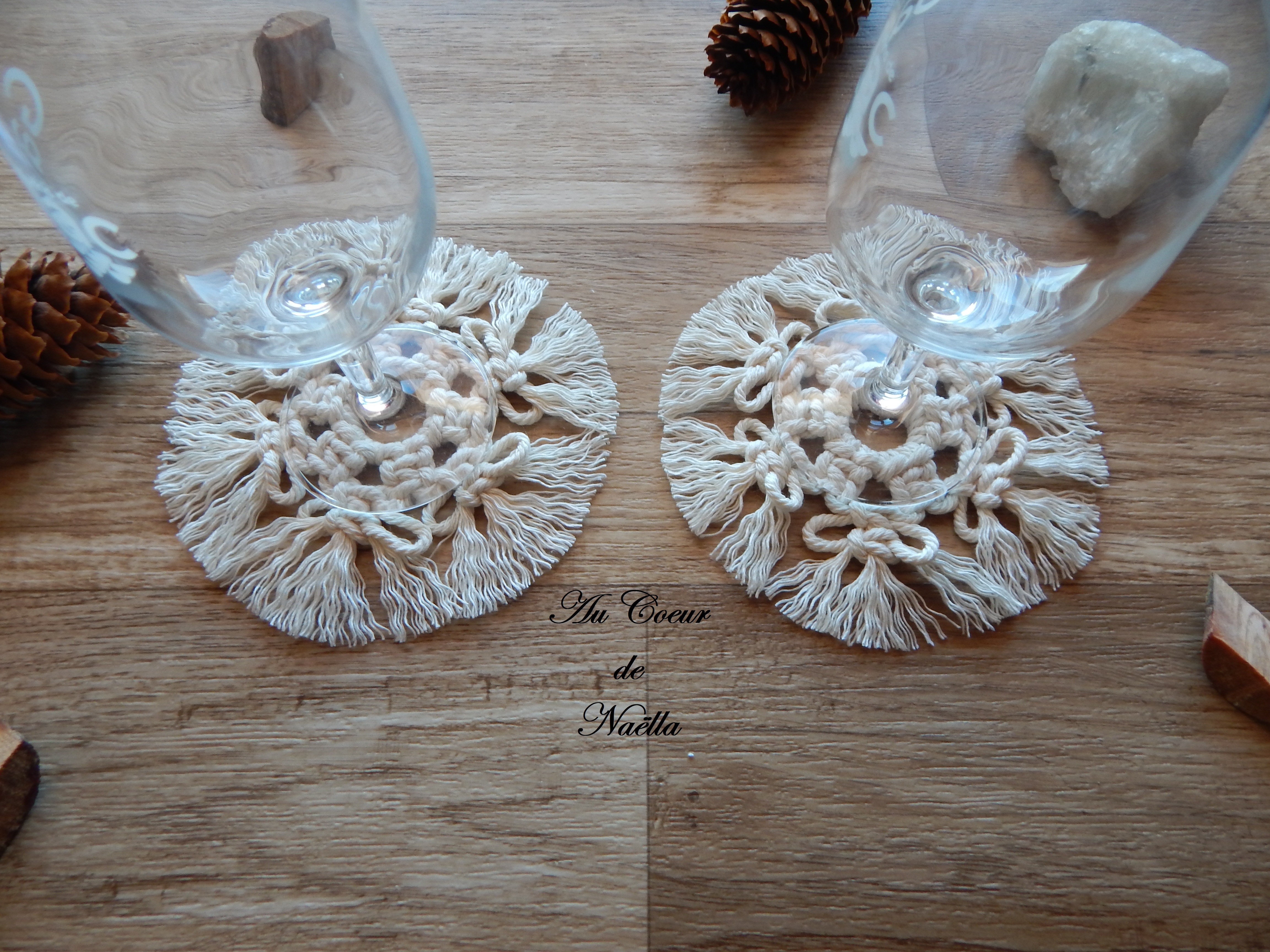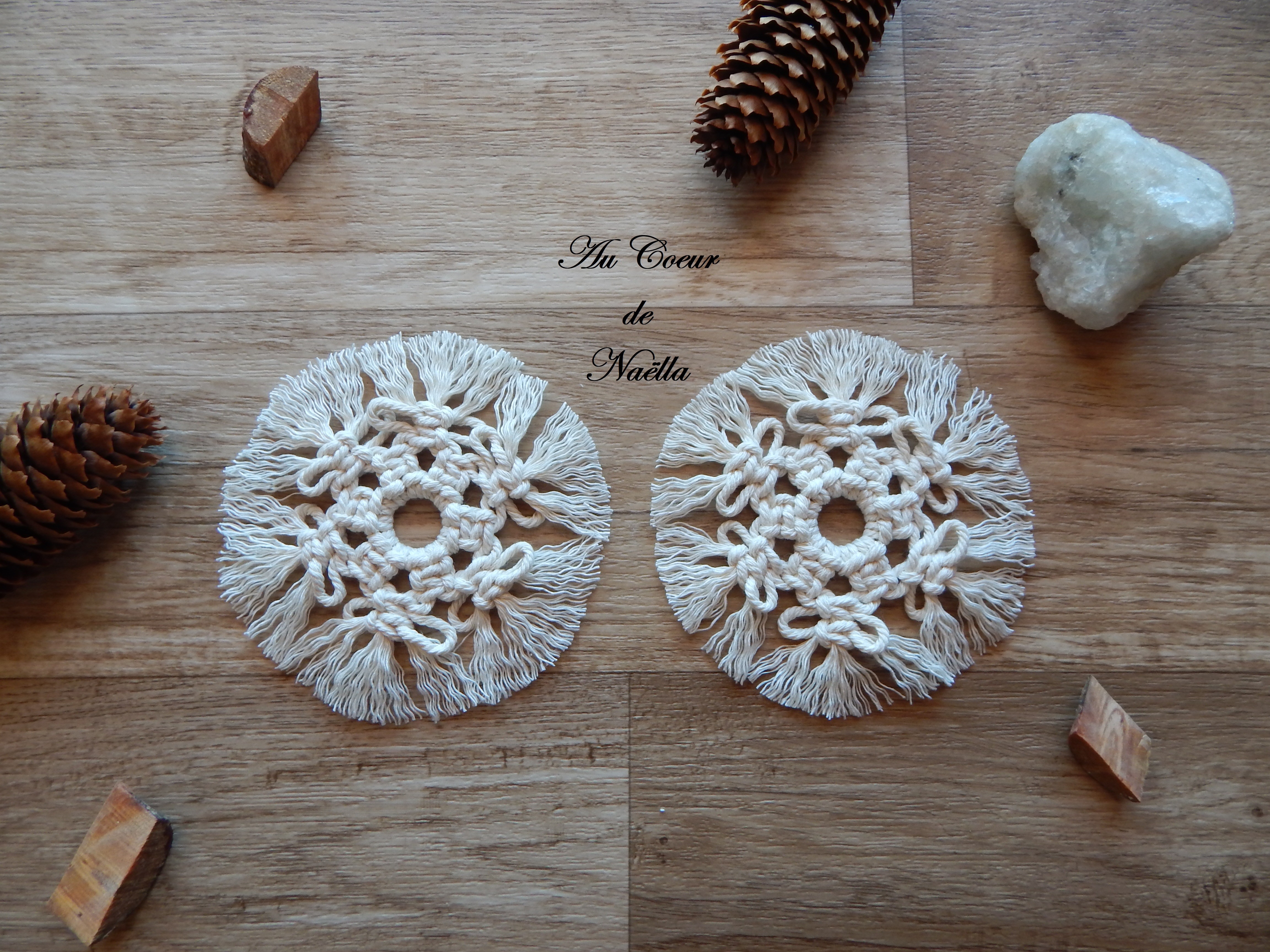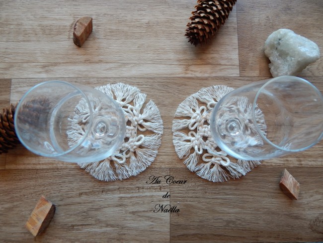 Le lot de 2 dessous de verre ou napperons NELLA confectionné en macramé apportera une touche de décoration bohème chic à votre intérieur.