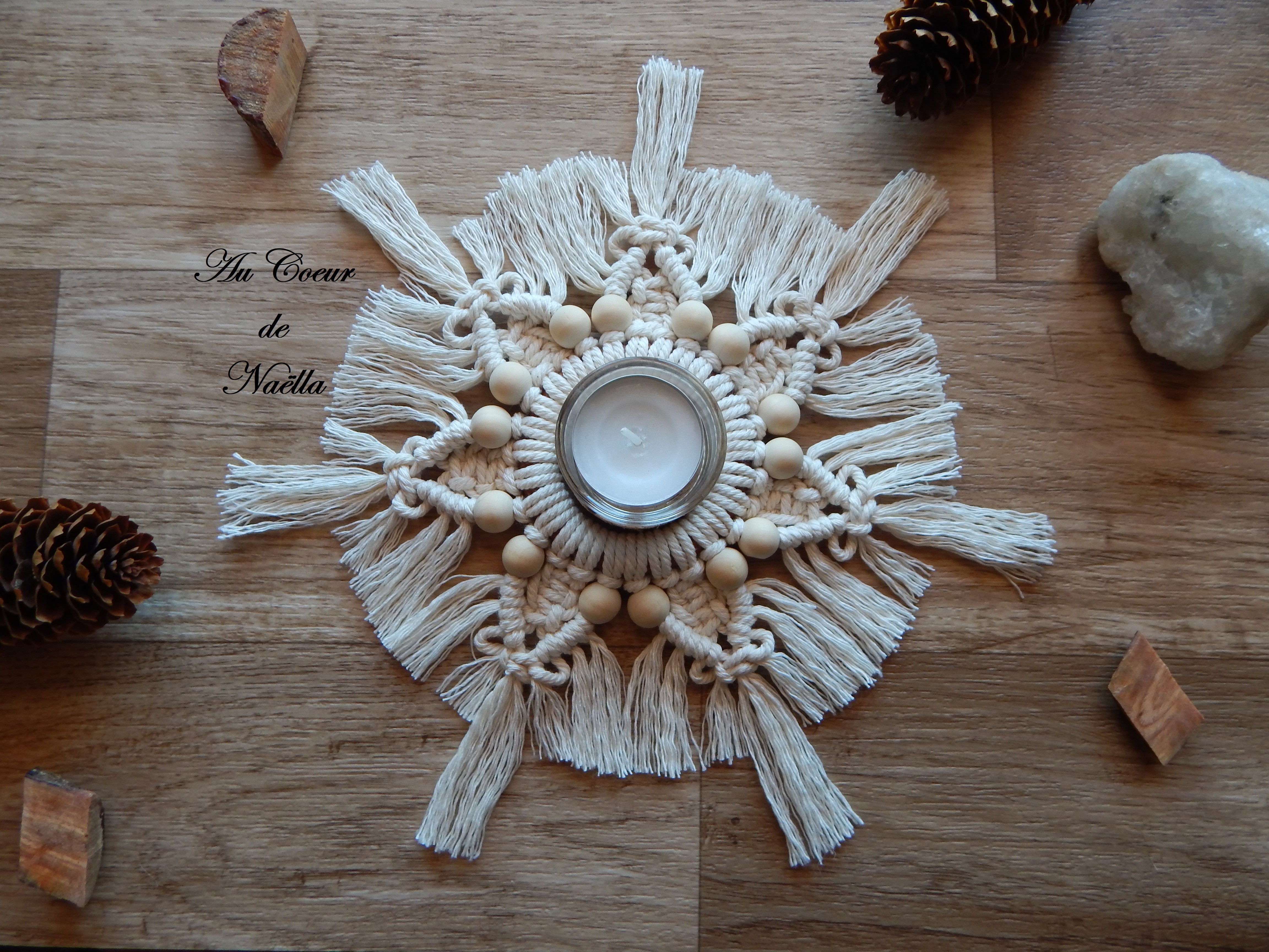 Le centre de bougeoir NAËLLA confectionné en macramé apportera une touche de décoration bohème chic à votre intérieur.