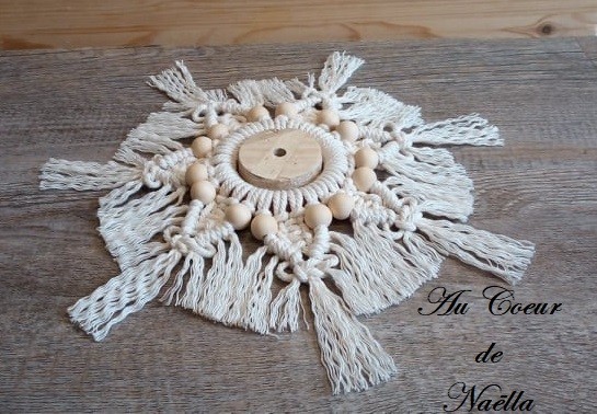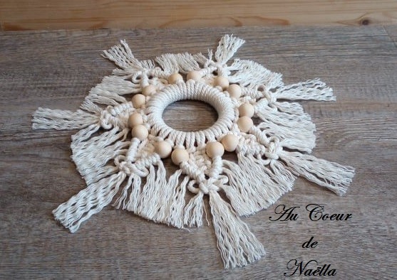 Matériaux : coton, perles en bois brut, anneau en bois recyclé, support en bois osb recyclé.