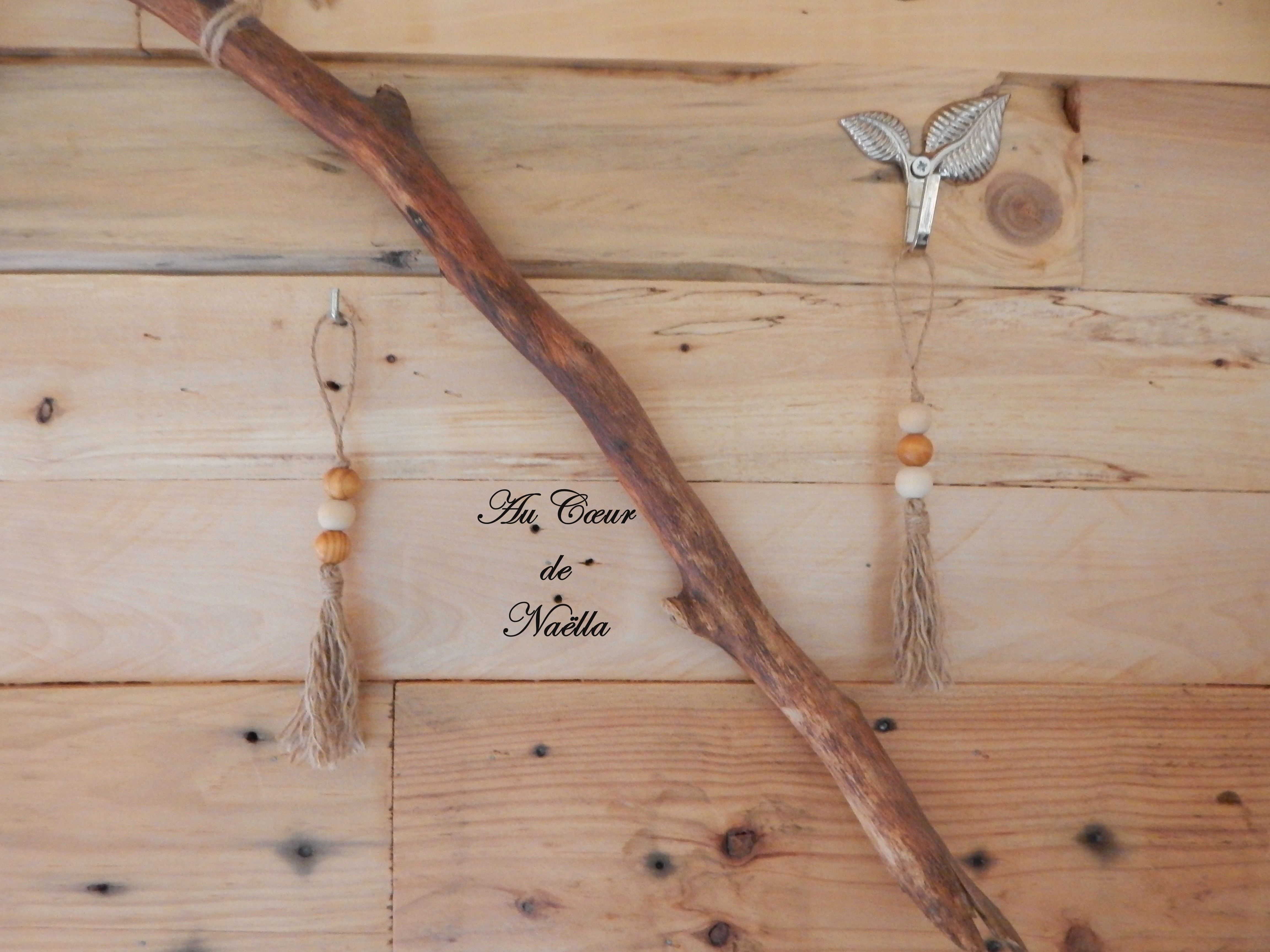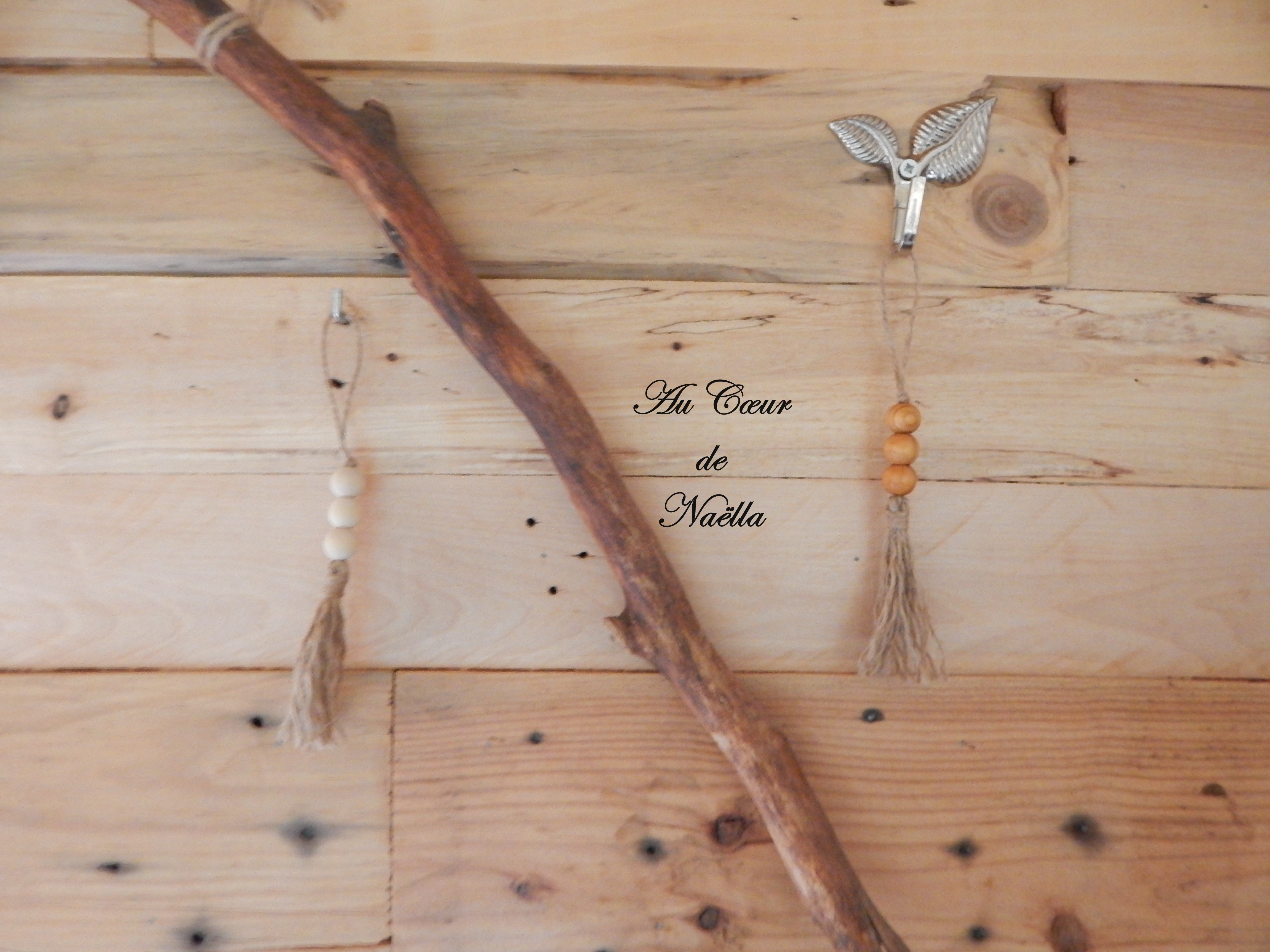 Matériaux : jute, perles en bois brut et peint.