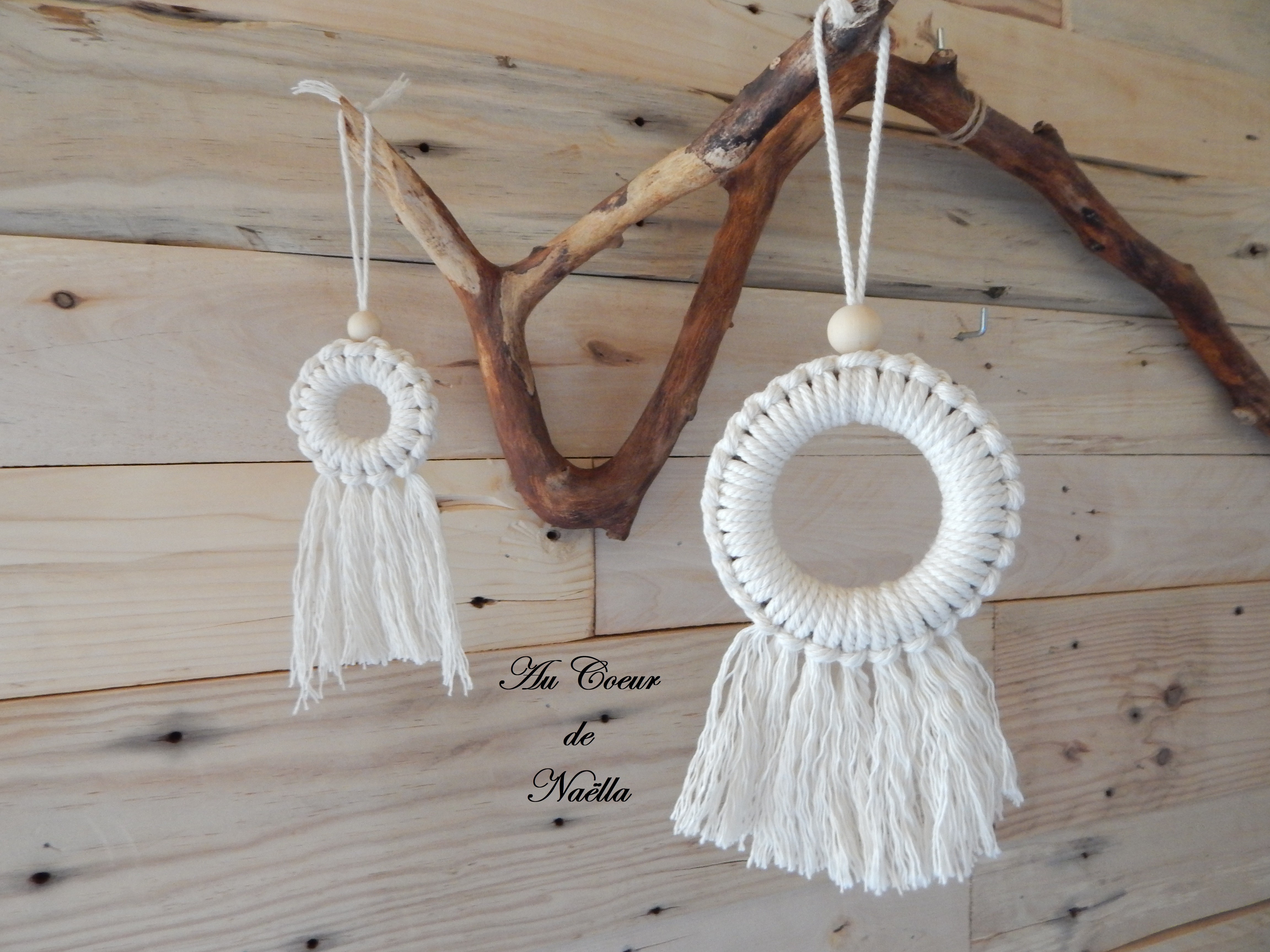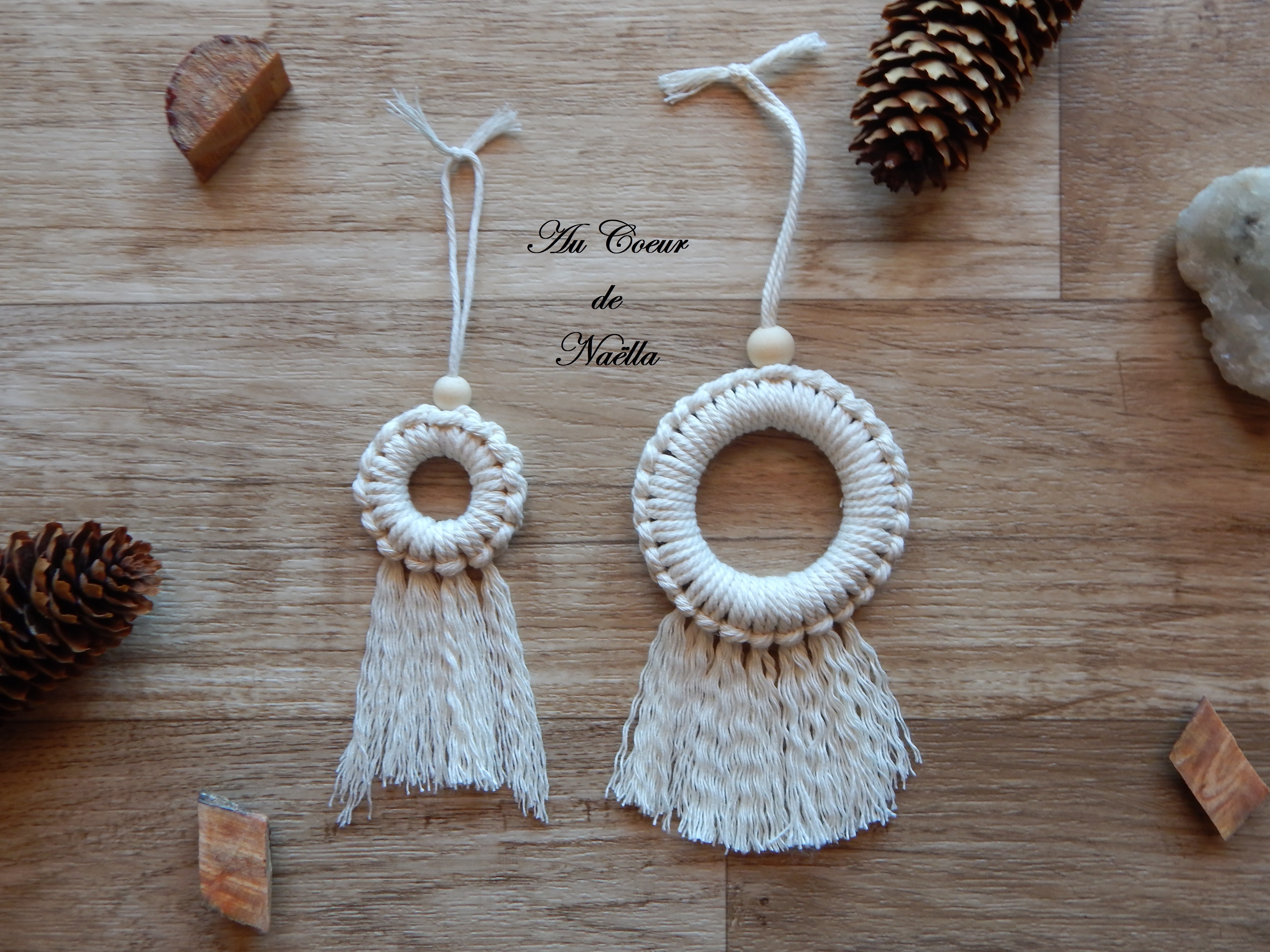 Matériaux : coton, anneaux en bois, perles en bois brut.