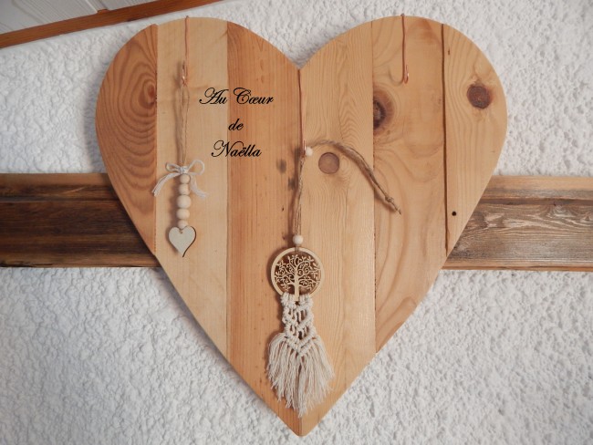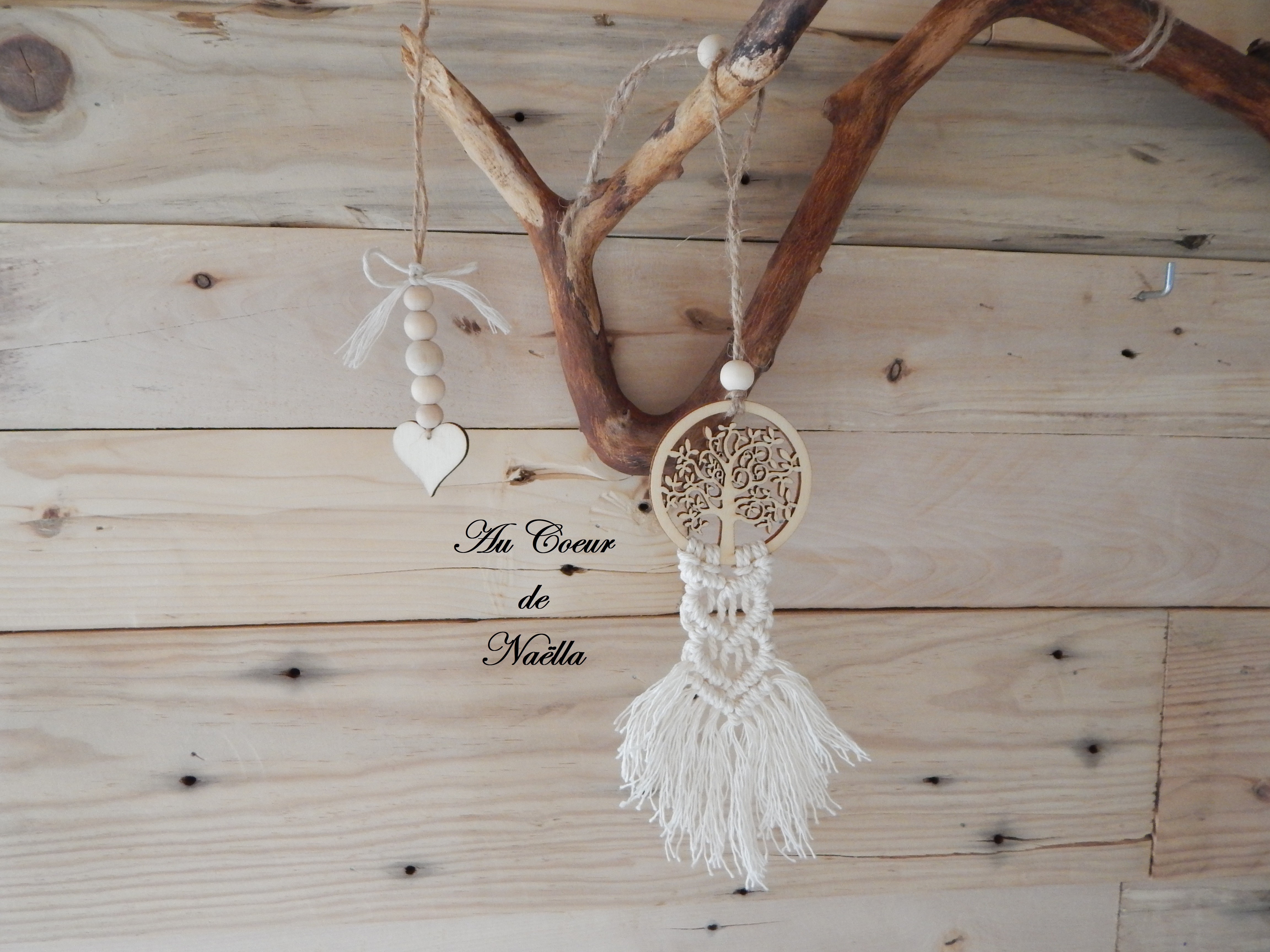 Matériaux : coton, jute, arbre de vie en bois brut, coeur en bois brut, perles en bois brut.