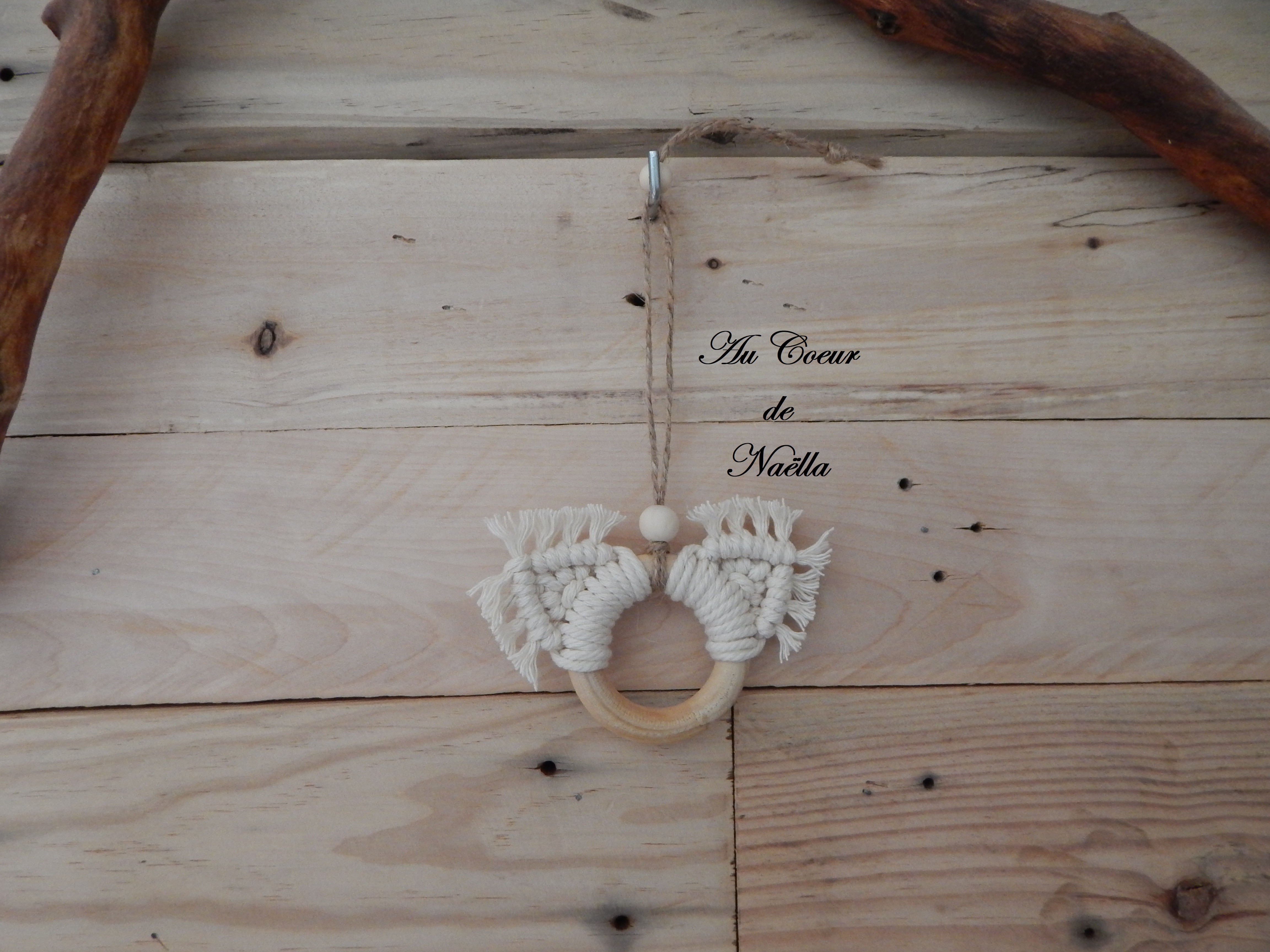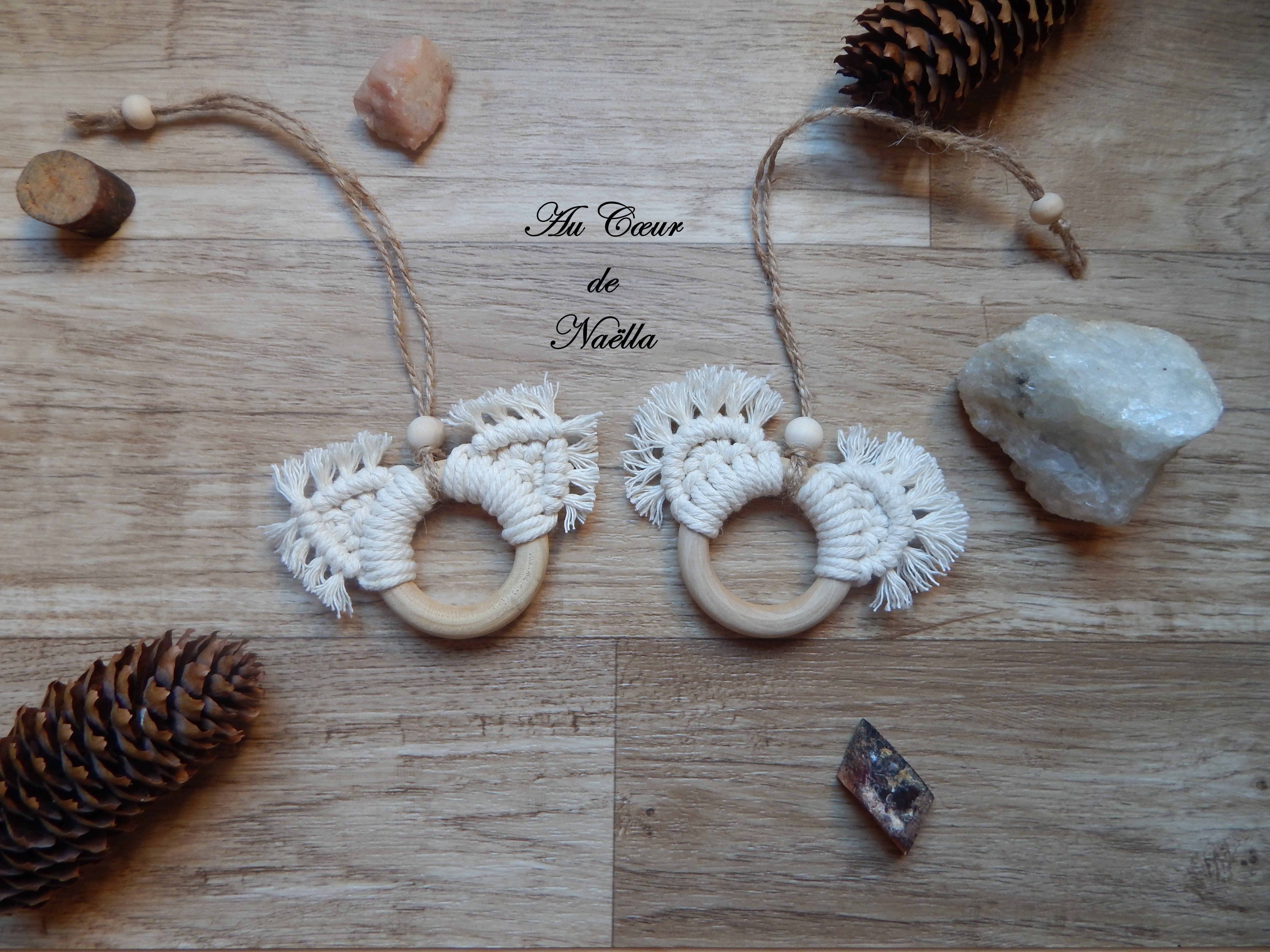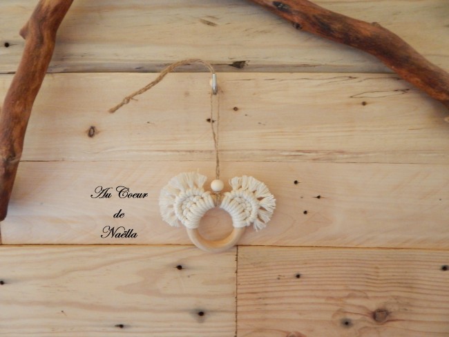 Matériaux : coton, jute, anneaux en bois brut, perles en bois brut.